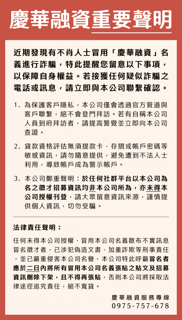 歡迎您光臨「慶華融資」(以下簡稱本網站),任何瀏覽或使用本網站之行為,均視為您已了解並同意自行承擔相關風險。本網站對於因瀏覽或使用本網站所可能產生之任何損失,概不負責,亦不提供任何明示或默示之擔保。